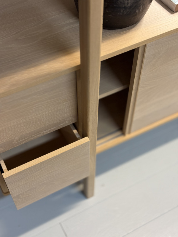 The bookcase is produced in veneered oak with solid beams. The cabinet section has two sliding doors in the centre that conceal a long movable wooden shelf. Both sides have two smaller drawers that are installed with push-open.