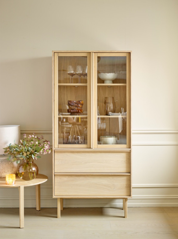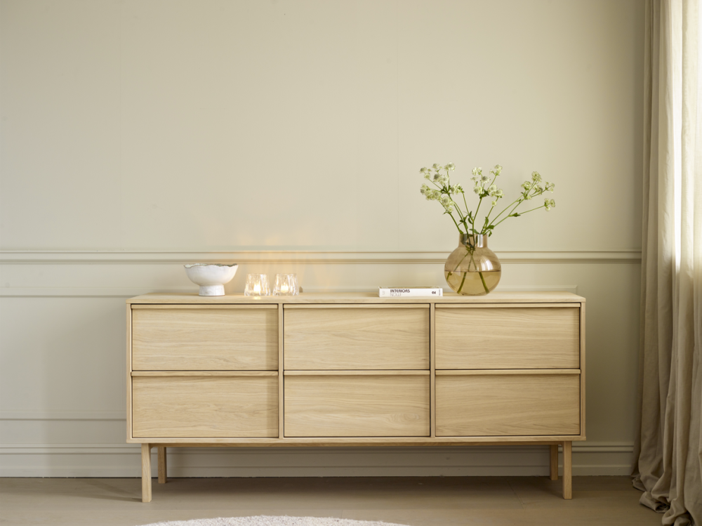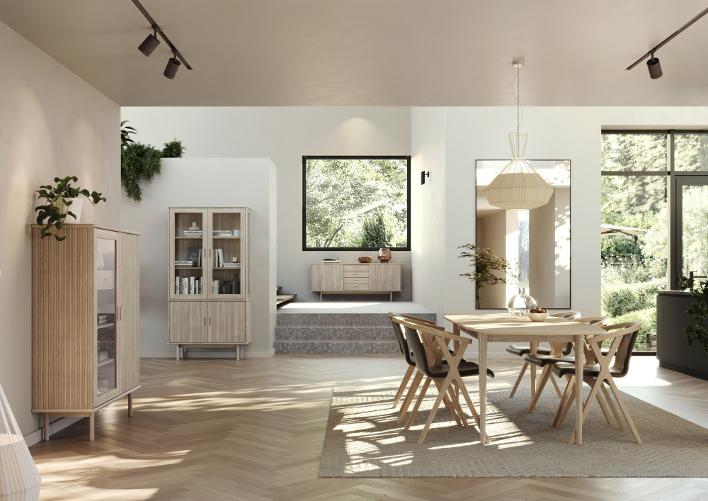 See all the furniture in the seriesNy serie af elegante møbler i stavlimet egetræ for et helt unikt spil i træet.